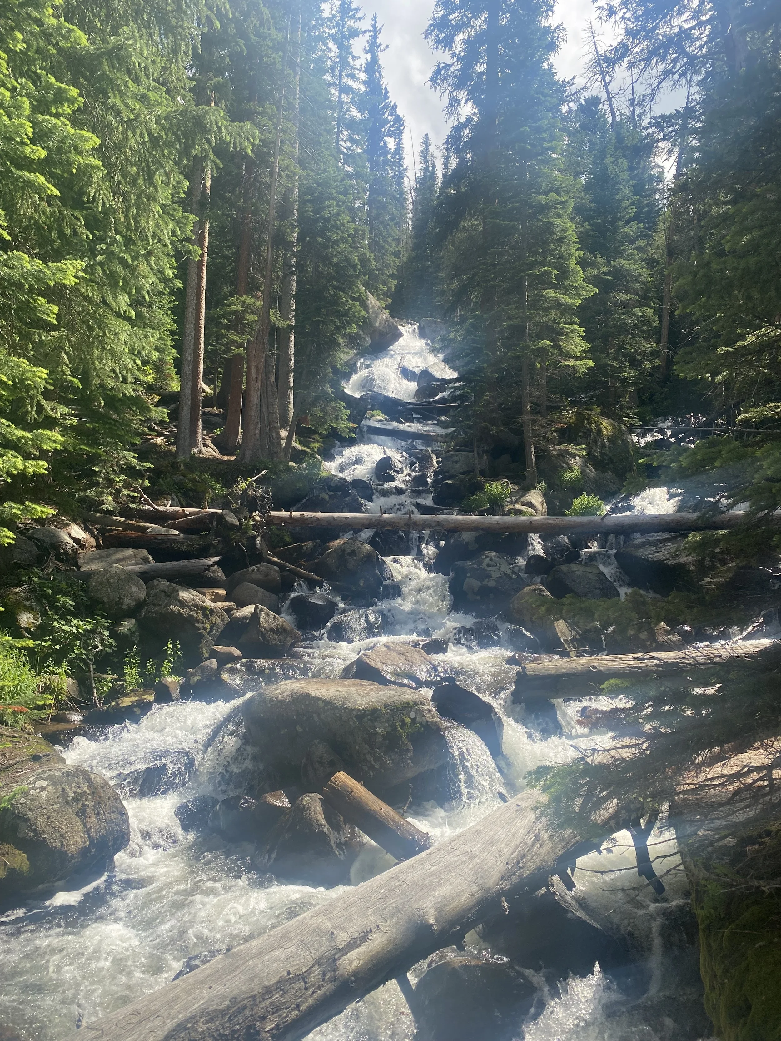 A forest scene with a waterfall flowing over rocks amidst tall trees and fallen logs, illuminated by sunlight.