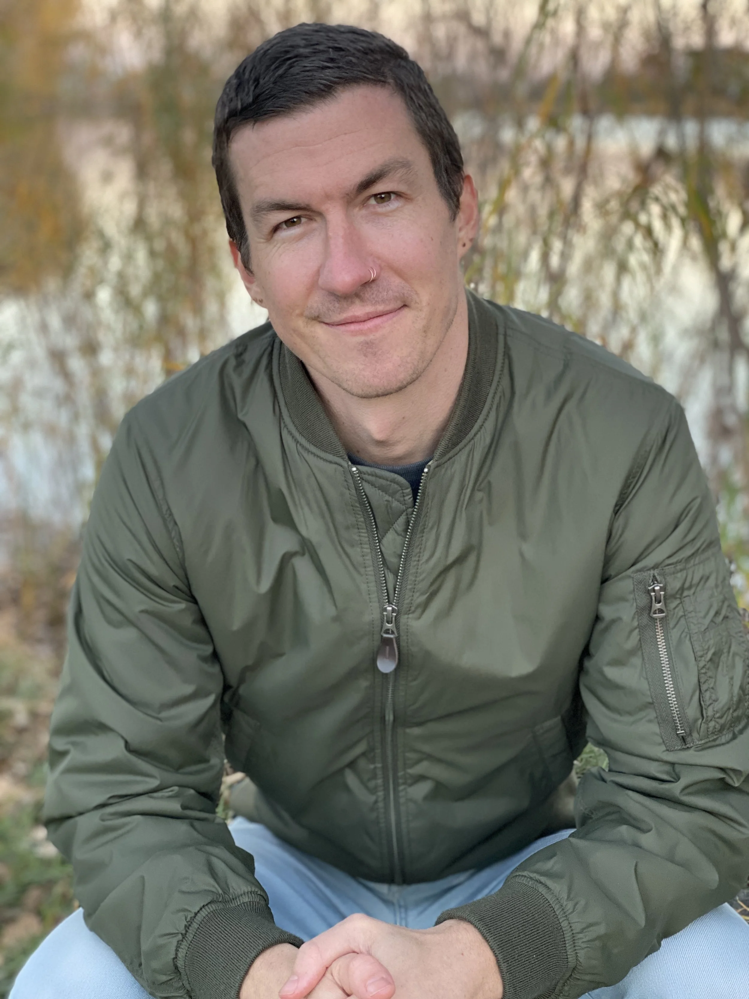 A man with short dark hair, wearing a nose ring, a green bomber jacket, and light blue pants, sitting outdoors near water with trees in the background.